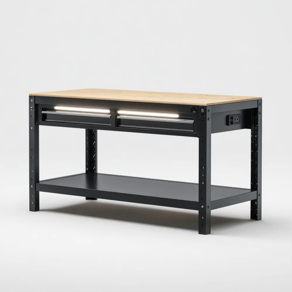 Établi en acier avec plateau en bois 120x60x90 cm – Noir – Éclairage intégré